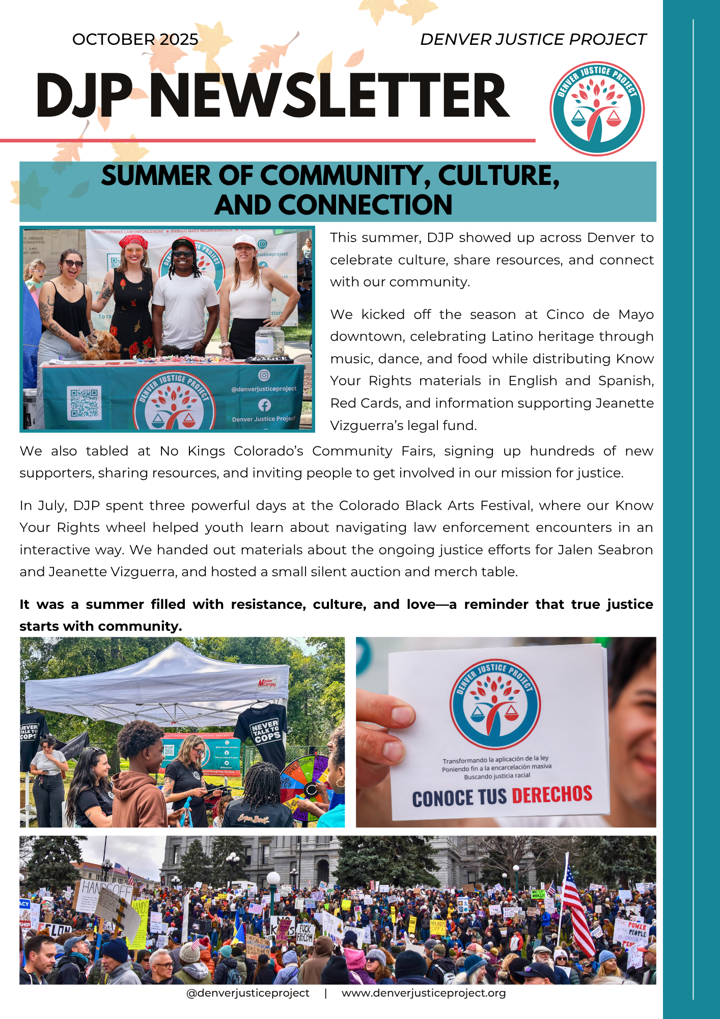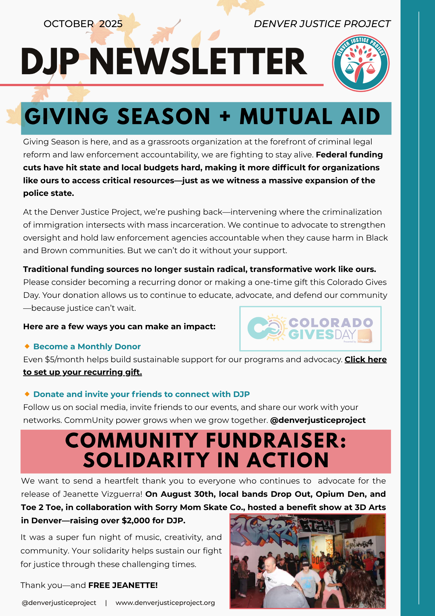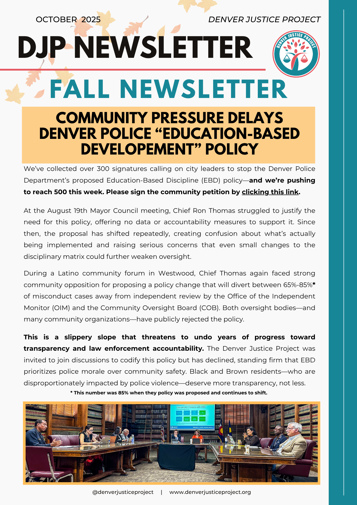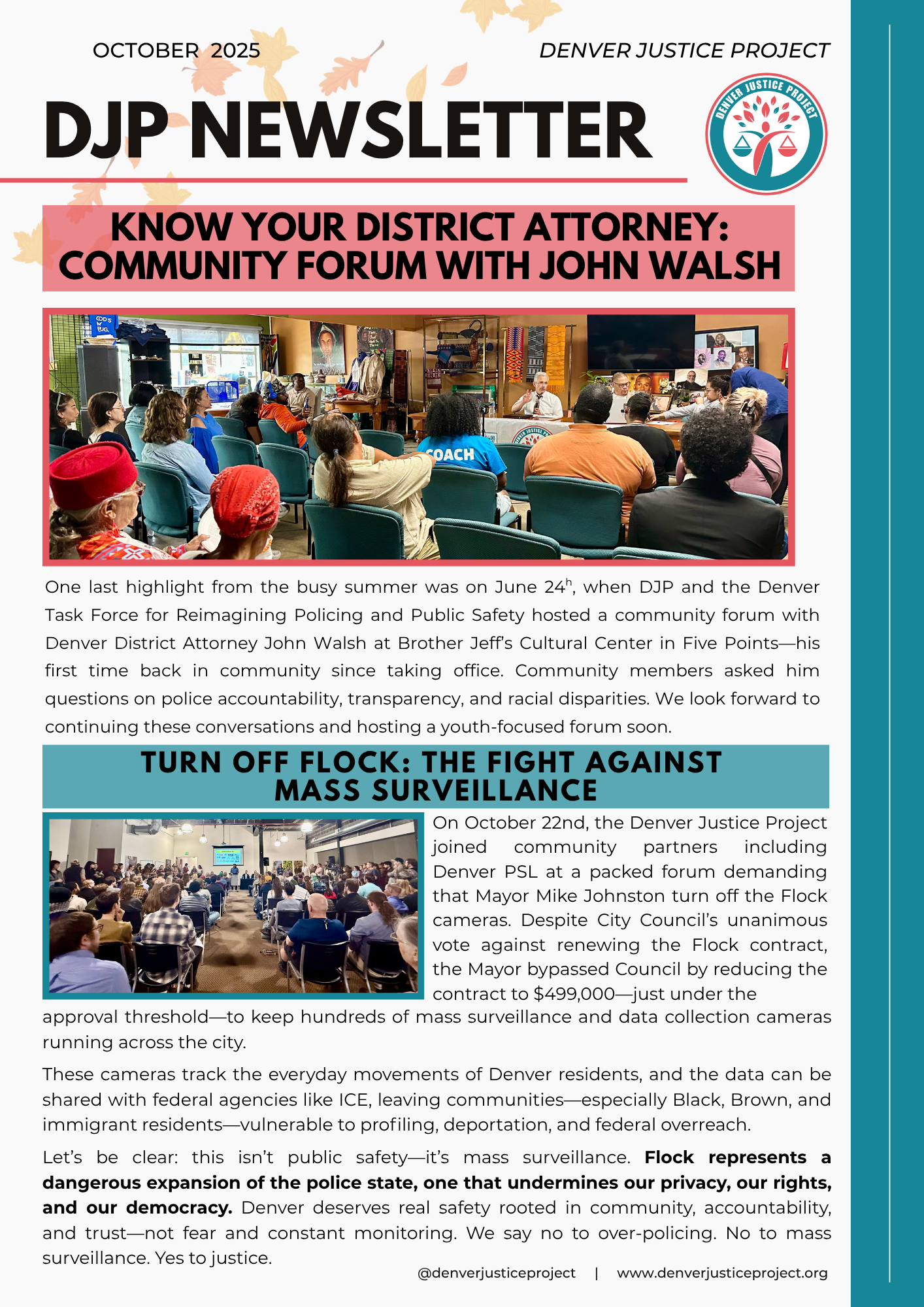 FALL NEWSLETTER 2025SIGN OUR COMMUNITY PETITIONBECOME A RECURRING DONORSUPPORT OUR WORK!Casey Childres2025-10-30T19:56:04-06:00Share This Story, Choose Your Platform!FacebookXRedditLinkedInWhatsAppTelegramTumblrPinterestVkXingEmail Related Posts NO FLOCK: Standing Against Mass Surveillance in Denver NO FLOCK: Standing Against Mass Surveillance in Denver AURORA WARD 1 CITY COUNCIL CANDIDATE FORUM AURORA WARD 1 CITY COUNCIL CANDIDATE FORUM Denver Justice Project Opposes Education Based Development Denver Justice Project Opposes Education Based Development In Community at the Colorado Black Arts Festival In Community at the Colorado Black Arts Festival